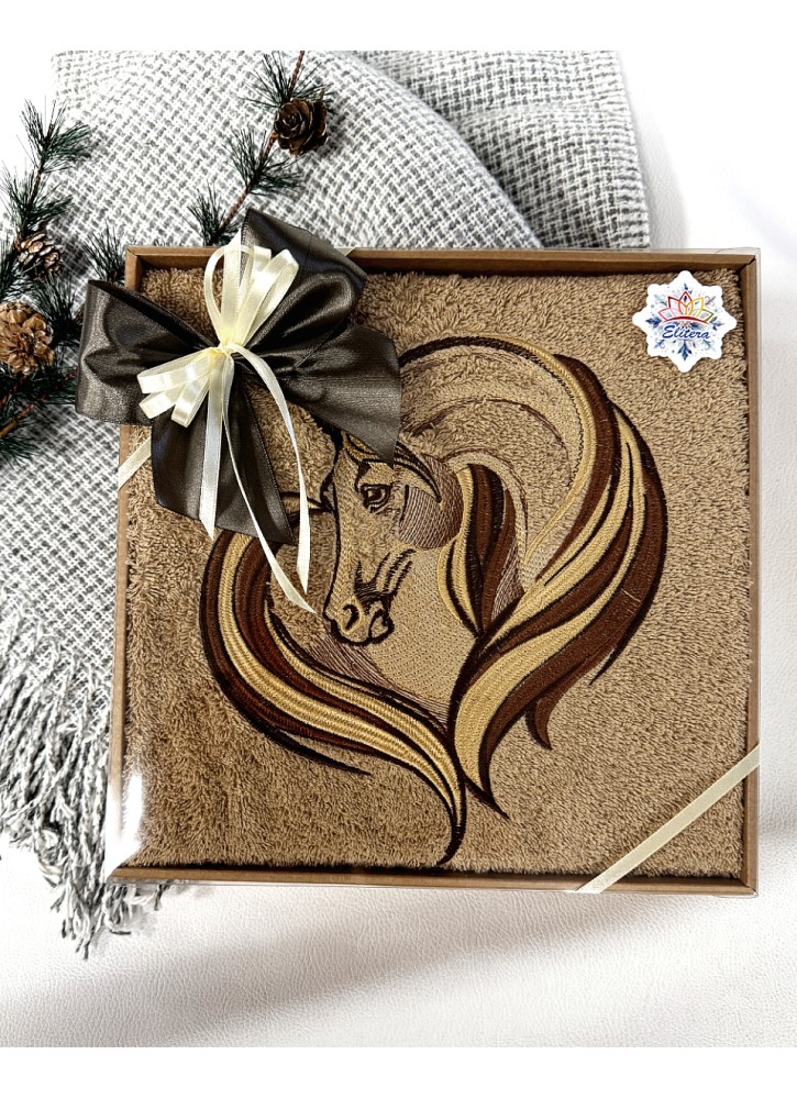 Augstas kvalitātes, biezs un mīksts frotē dvielis ar izšūtu 2026. gada simbolu piešķir svētku dāvanai izsmalcinātu un vīrišķīgu raksturu.