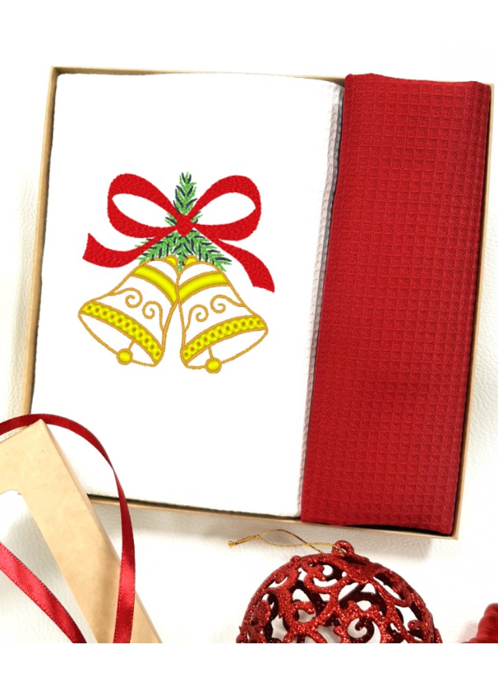 Virtuves vafeļu dvieļu komplekts izrotāts ar izšuvumu un iepakots kastē. Koša Ziemassvētku dāvana svētkiem.