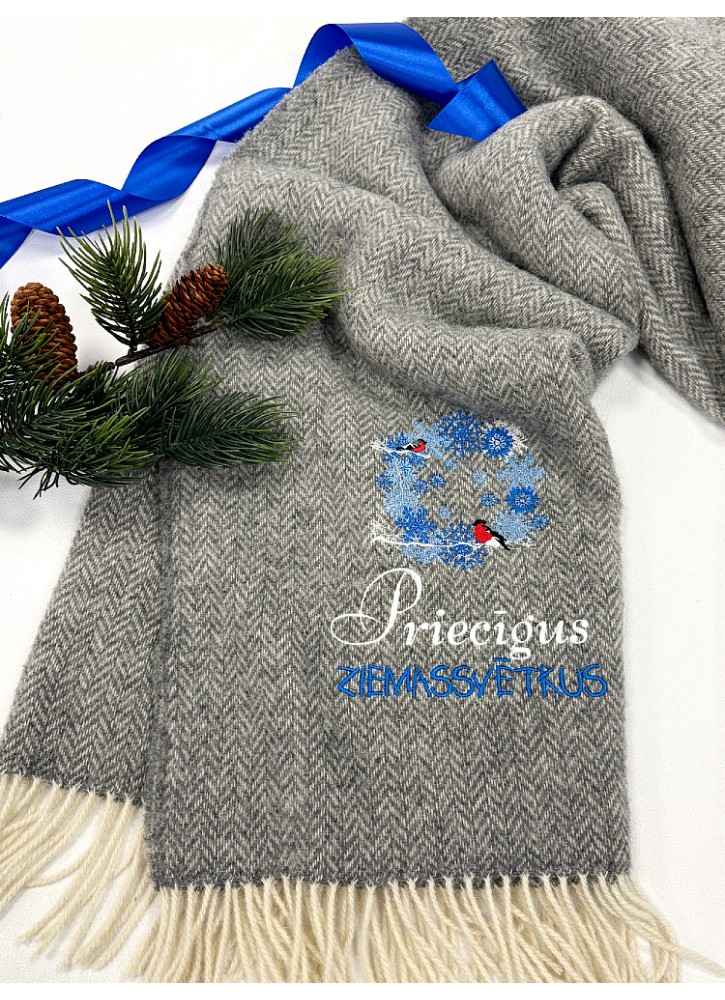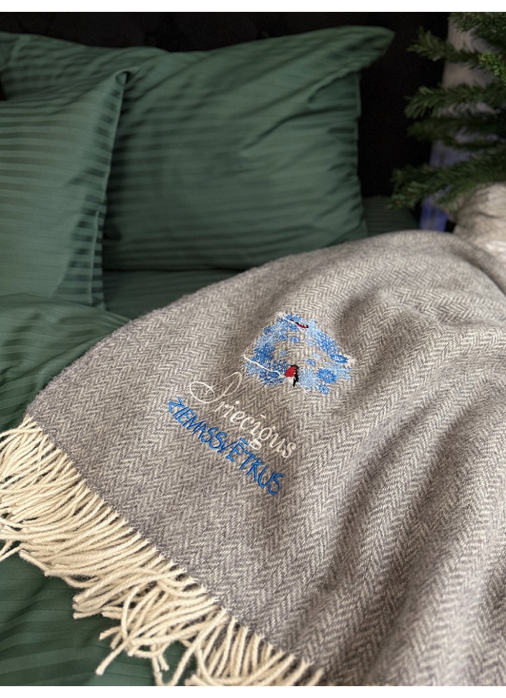 Vilnas pleds ar izšuvumu – Sirsnīga dāvana Ziemassvētkos, pelēks |ZS92