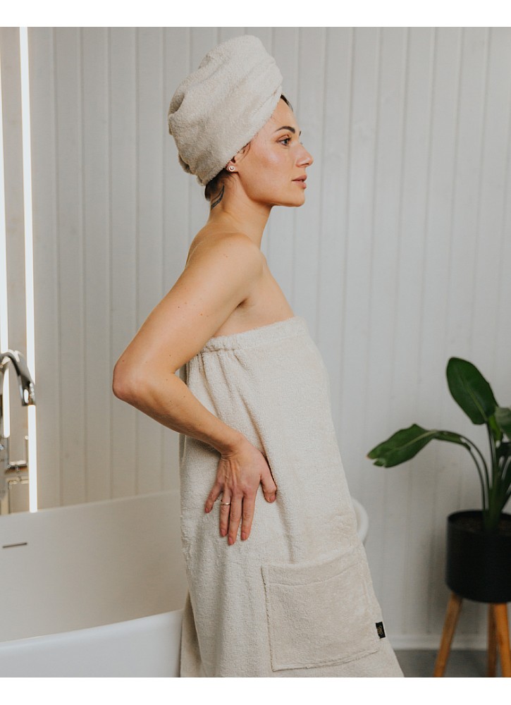 Sieviešu frotē saunas dvielis ar kabatu SOLO almond