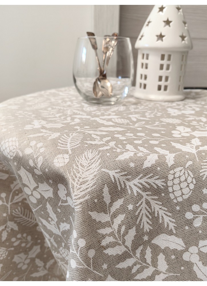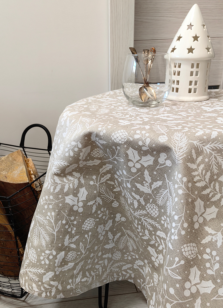 Lina galdauts lieliski papildina Ziemassvētku dekorus, izceļ traukus un svētku kompozīcijas.